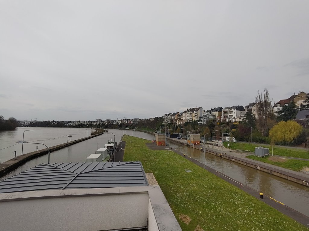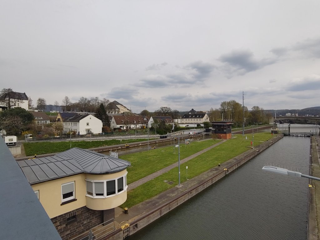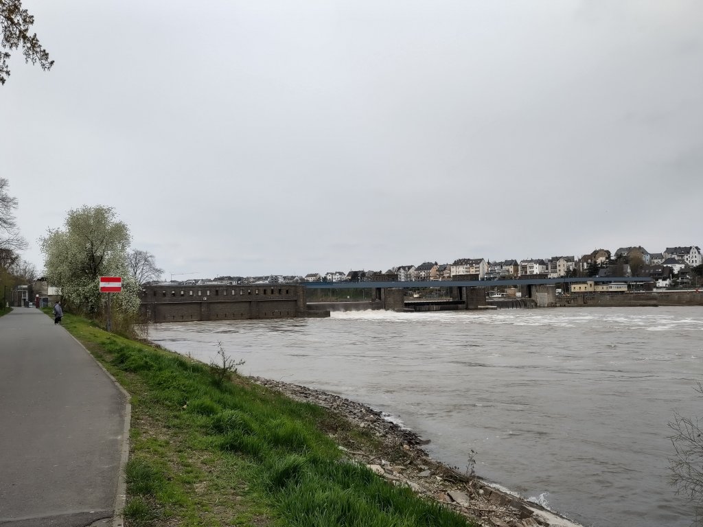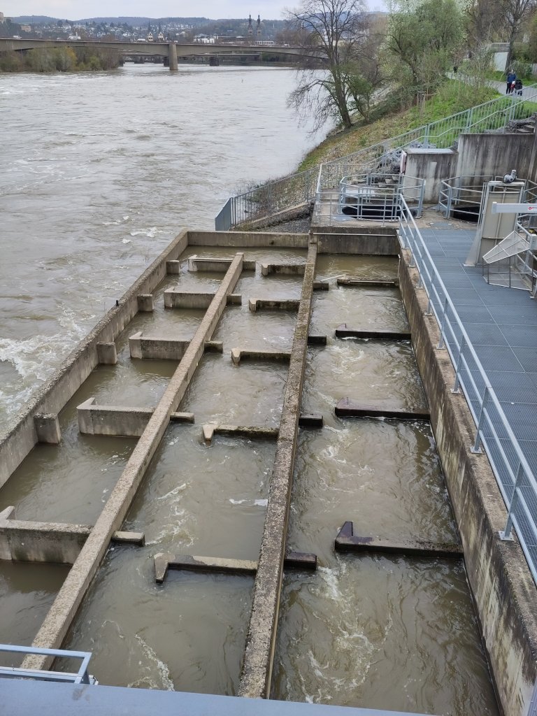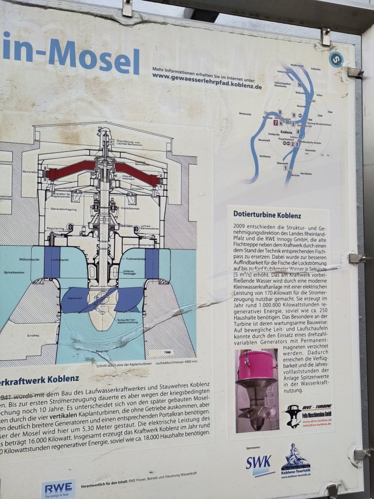 Massive Kaplan screws placed vertically. We are more used to Archimedes screws, at a slight angle.They built them big in the 1950’s all down the river Mosel, some with more familiar turbine orientation.The left hand side is the power plant (fish pass obscured by the trees), middle is the water busting out under the raised one of the two massive sluice gates. To the right is the embankment of the lock system.