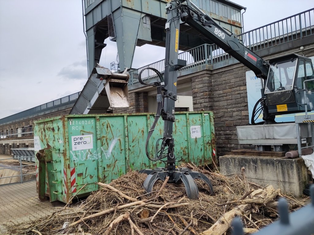 “It’s the claw!” Grabbers grab the trash. One from the screens onto a conveyor, this one mucks about with it once gathered.Upstream side of the power plant. There’s a rail along under those windows that a digger grabber runs along to clear trash. In the foreground is a visiting dog who’s not so excited.