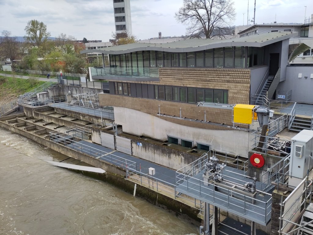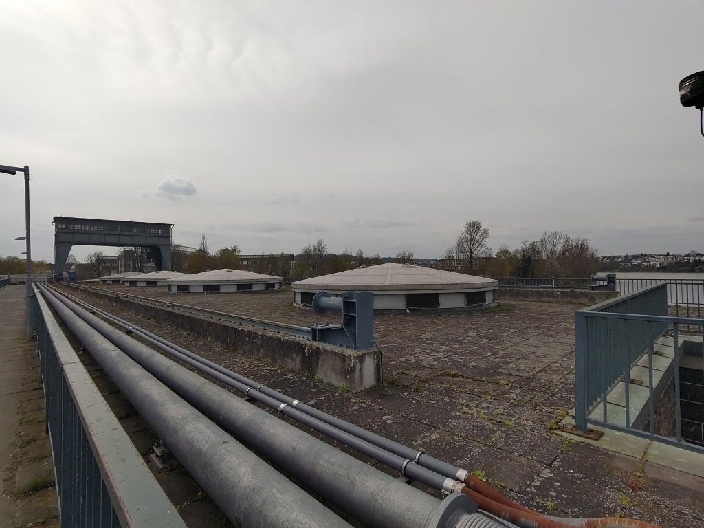 The covers of the four turbine shafts, with the wheeled gantry house in the distance, and the rails it is on running towards you. The awesome, if ugly, huge eel pass even has a museum built on top of it. Designed in 2009, the museum has scaly skin.Little steps in a zig zag, for slow swimming fish like eels to wind their way up, bypassing the weir and turbines.When one huge lock isn’t enough, build two.The upstream entrances to the locksTiny railway dog on the huge footpath over the hydro and weir. He knows about hydro. He helped build one in Reading.