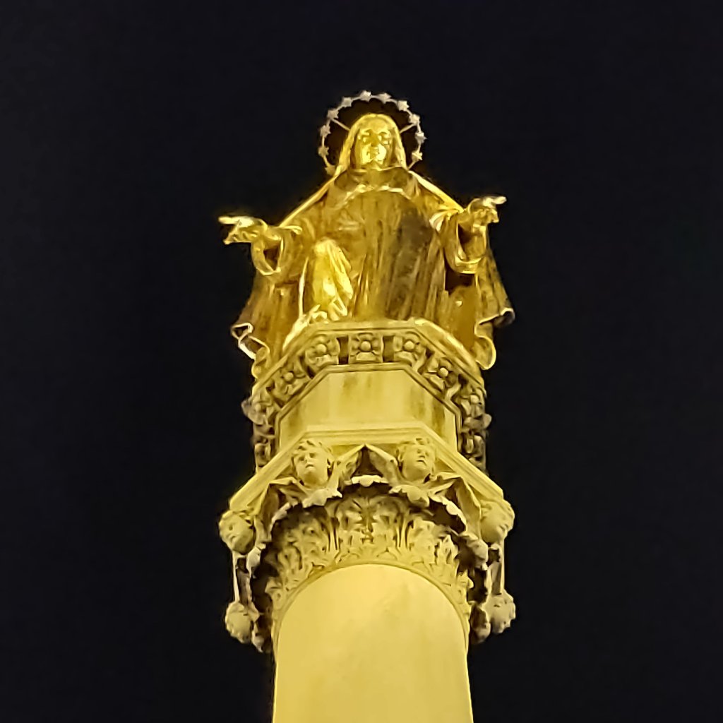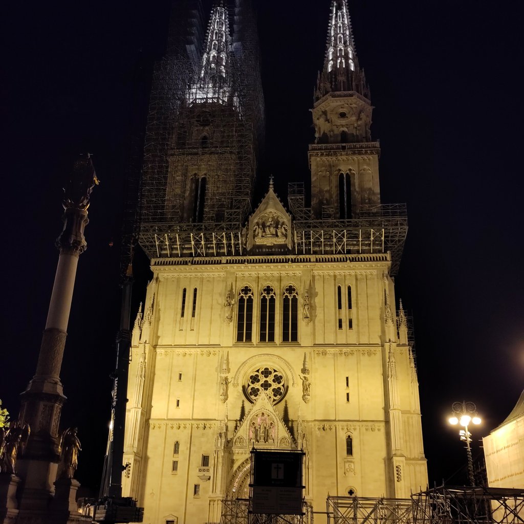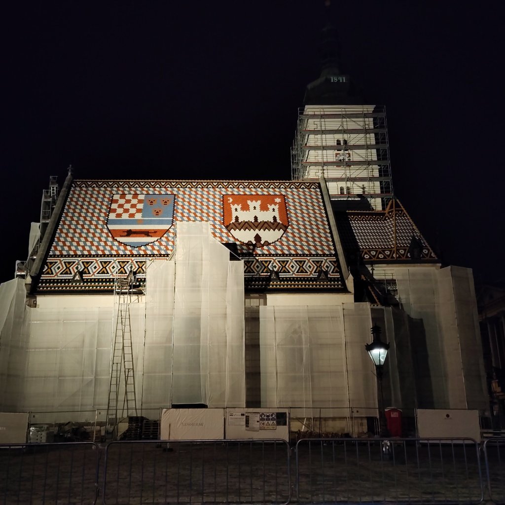 Scaffolding everywhere, due to repair of damage caused in the 2020 earthquake, which particularly affected facings, towers and roof tiles. Here’s a repaired fake crochet roof.