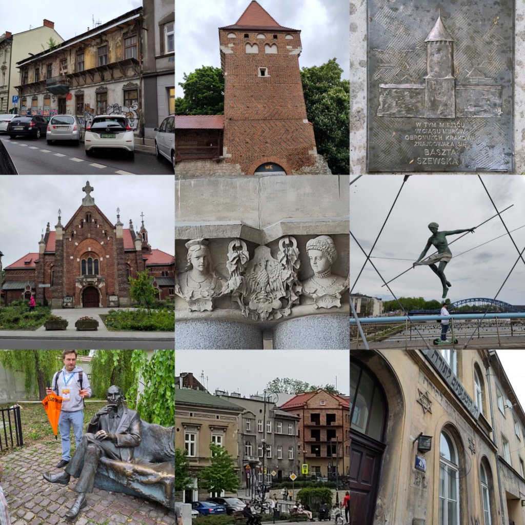 Krakow has some blatantly obvious glorious big buildings in the largest medieval square in the world or some such. So I photographed other things. Above you see a dilapidated old building, the carpenters’ tower, a marker for one of the many towers and wall segments removed to make a circular park in the 19th century, a tucked away church (so many, plus monks and nuns), stone medieval faces, a swinging balance statue on a bridge, a statue of a Polish spy (who got news out of Nazi atrocities, even speaking to Roosevelt, but felt deliberately not listened to), the location of the Krakow ghetto (which kept shrinking), a former synagogue (only 1 of 4 is now active).