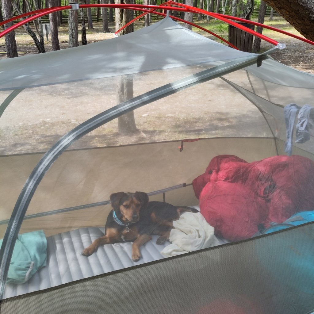 The beach is a short walk through the manmade forest. The immediate choice is women’s beach or nudist beach, so modest men and enbies have to walk a bit further north. No dogs allowed, but the campsite said that only applies in high season, so Baspie dog had a fine time.