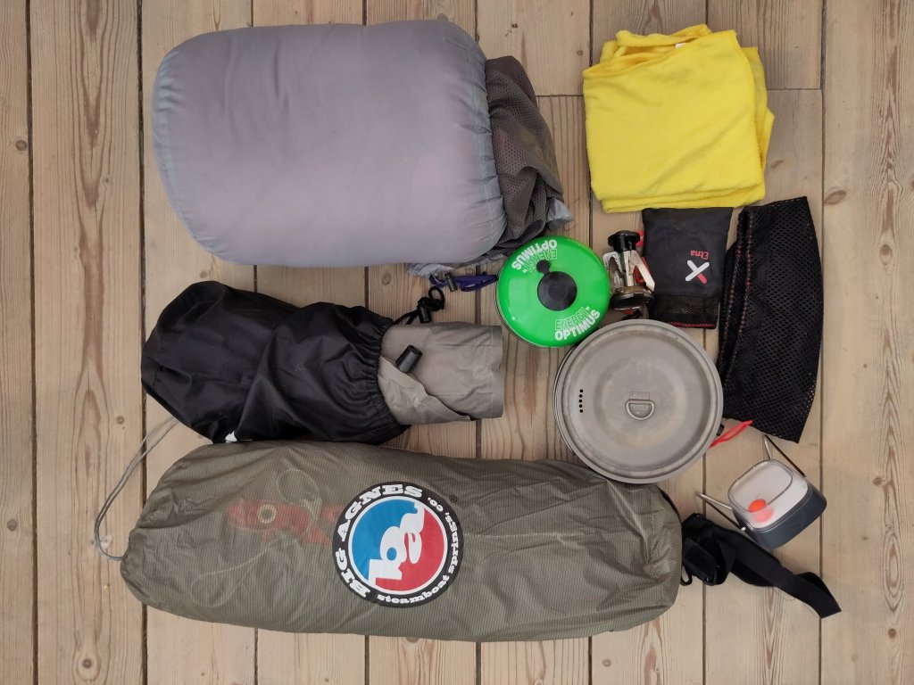 Apart from food and drink, much weight is camping gear. 1.4kg tent, sleeping bag, lightweight mat, camping stove, camping gas, cooking stuff, solar lamp (Solar Aid), and e-cloths as towels.